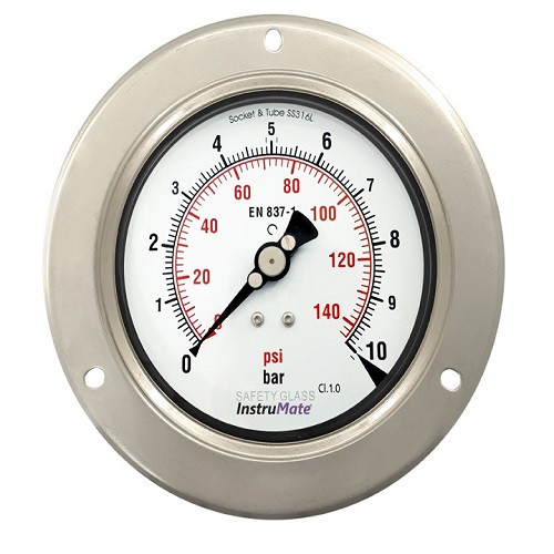 گیج فشار تمام استیل اینسترومیت اتصال از پشت با رنج کاری 0 تا 10 بار، در سایز صفحه4،5،6،10،16 سانت. امکان تزریق روغن، دریافت گواهی کالیبراسیون آزمایشگاه