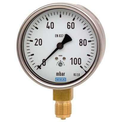 Bourdon tube pressure gauge, copper alloy, 0-100 mbar, wika